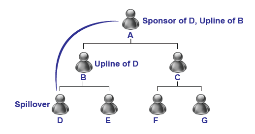 In this case, member D's sponsor is member A and upline is member B.