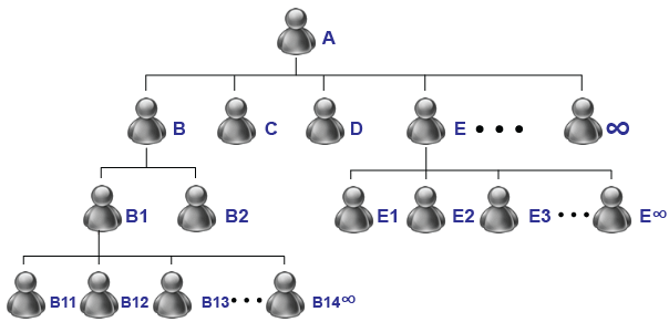 In this case, member A has sponsors his front line members B, C, D, E, ∞. The members B, C, D... are free to sponsor as many members as they want.